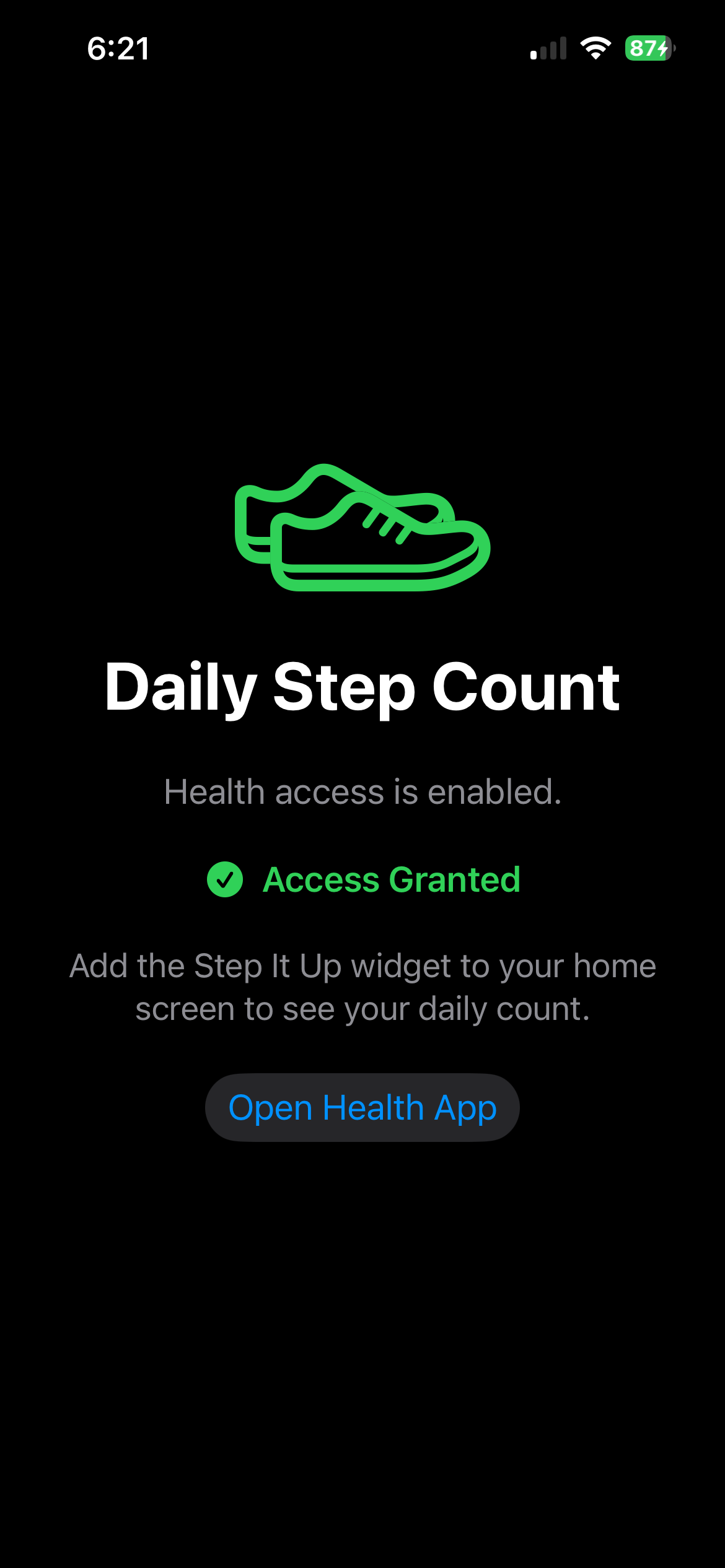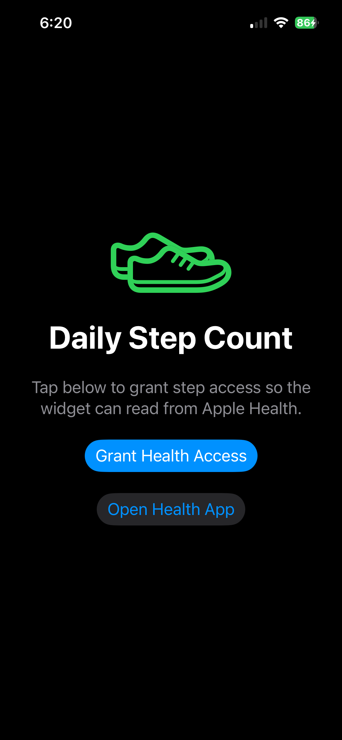 Tapping the widget opens Apple Health (if access is granted) or opens the DailyStepCount app to the grant-access screen (if access has not been granted).